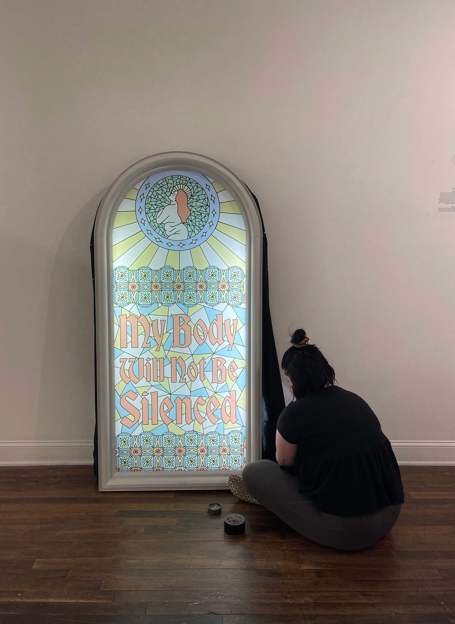 Silence Chapel is a large scale mixed media art installation piece featuring digital illustration printed vinyl applied an upcycled window, lit from behind with LED lights to mimic the look of stained glass. Silence Chapel is the long-awaited follow up to my Rebuild series, incorporating religious imagery and the feeling of being “in church” juxtaposed with words “my body will not be silenced.”